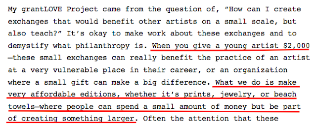 What is interesting to me is the last sentence. She is essentially saying that grantLOVE Project is an extension of her ongoing love themed solo art based on Antigone, the phrase 'Born To Love Not To Hate, the LOVE symbol which now represents grantLOVE Project and it's fundraising assets. grantLOVE was created to represent "grant's LOVE" philosophy. Therefore it is also meant to represent herself. This implies that grantLOVE was created to further promote her solo practice and her brand. In fact, she behaves as though both her and grantLOVE are the same entity.